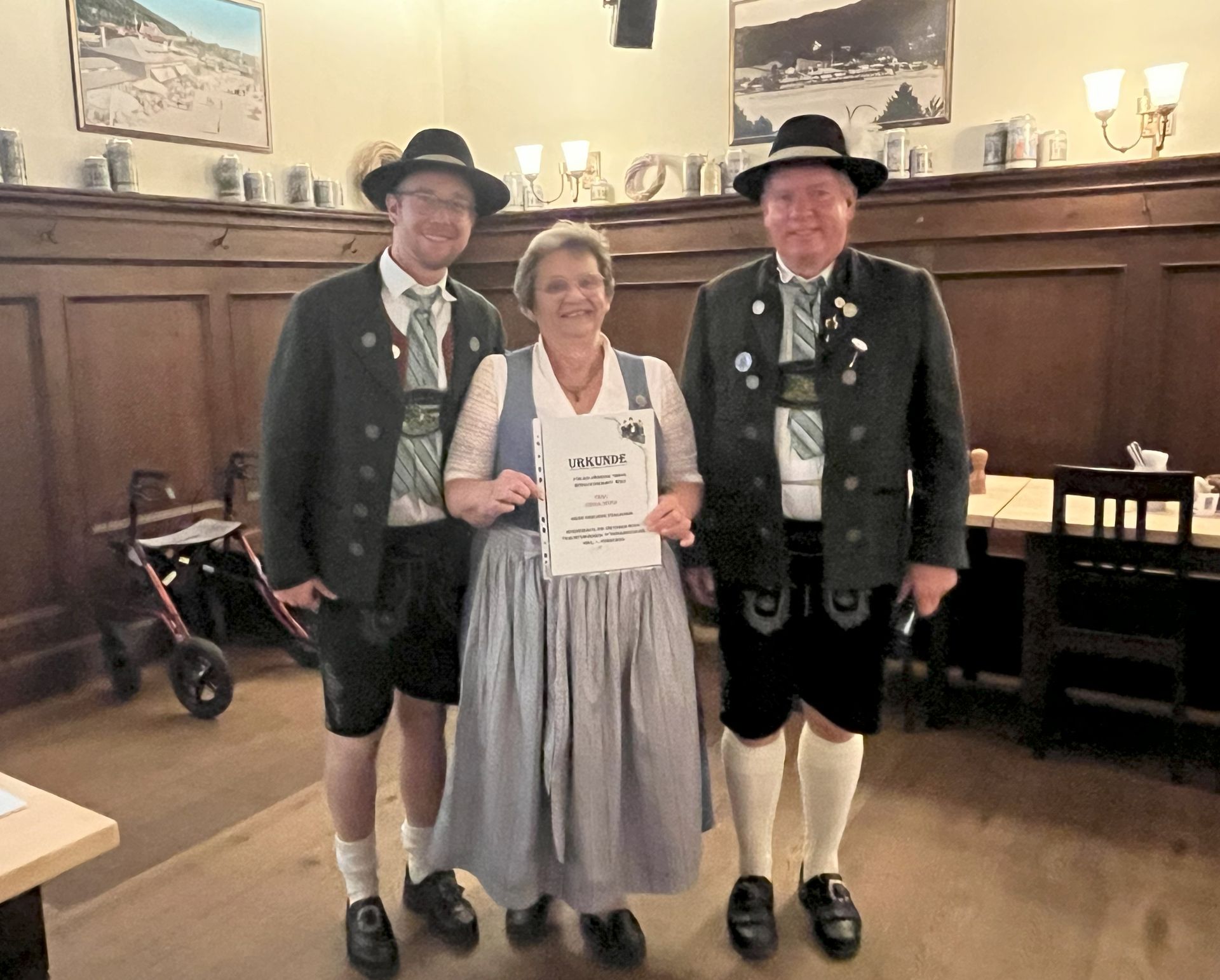 Gründungsmitglied und Schriftführerin Elisabeth Gabler wurde in diesem Jahr ebnefalls von Vortänzerin Martina Jursch geehrt. Seit dem Jahr 2006 wird eine Anwesenheitsliste bei den Vereinsabenden gepflegt. Elisabeth Gabler belegt auf dieser Liste seit Anbeginn der Aufzeichnungen, also seit 19 Jahren, den ersten Platz. Insgesamt war Elisabeth an 300 Vereinsabenden anwesend. Dies verdient großen Respekt, hohe Anerkennung und herzliche Glückwünsche!