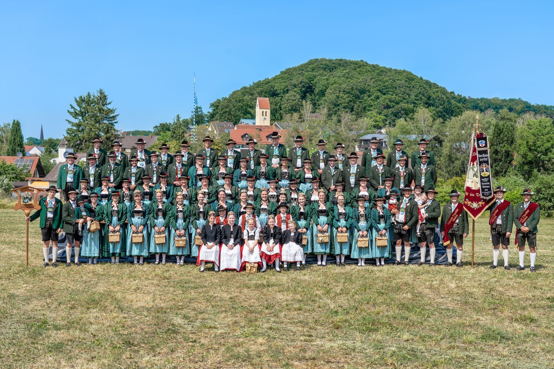 Anlässlich des Gaufestes 2024 wurde Mitte Juni eine neues Gruppenfoto mit ca. 80 aktiven D'Donarbilcher Trachtenvereinsmitgliedern aufgenommen. Als Hintergrund dienten unser Wahrzeichen - der Donarbichl - sowie der Steinebacher Maibaum