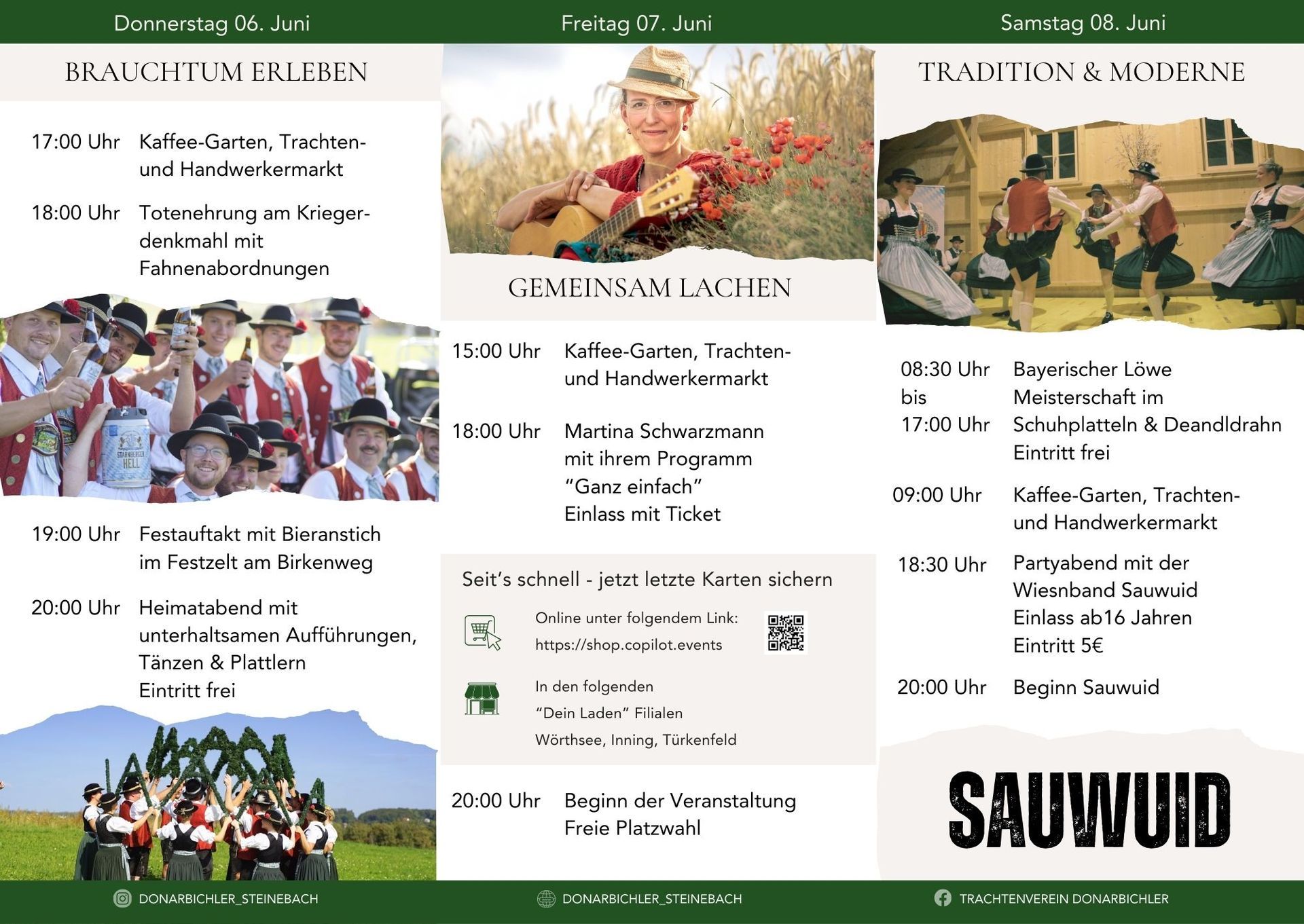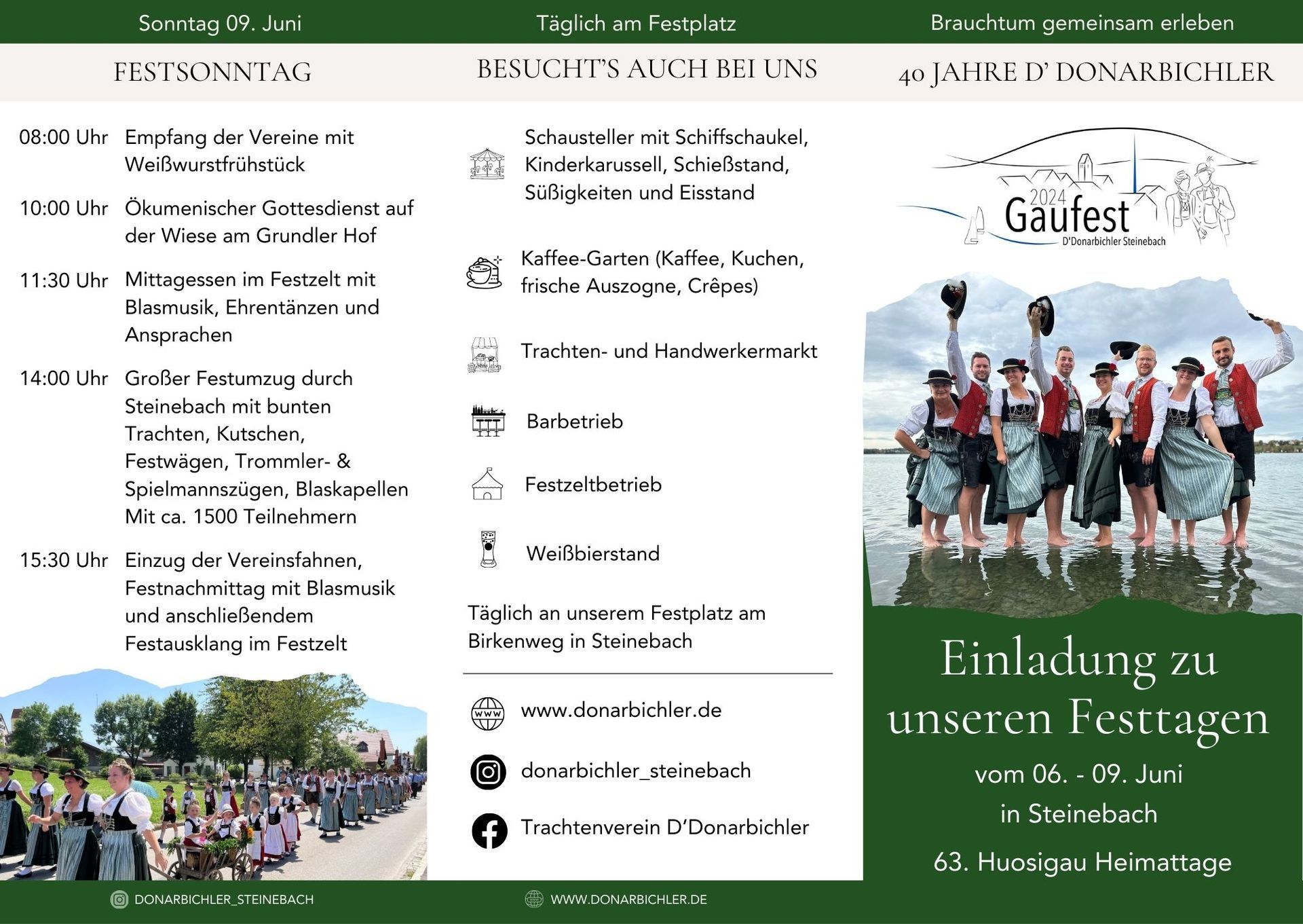 sowie der Festsonntag mit Umzug, am 9. Juni 2024, bei dem ca. 1.800 Trachtler aus dem Huosigau und Nordamerika erwartet werden.